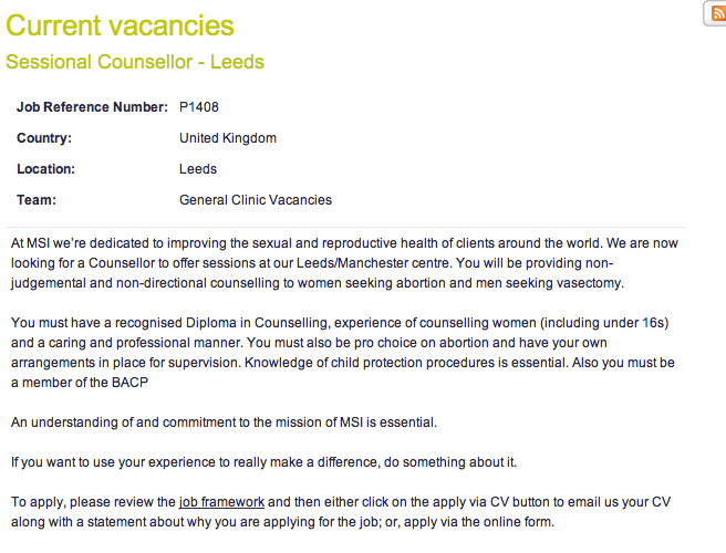 I found the following job advertisement for a Marie Stopes counsellor. It’s quite interesting, in that it states that a counsellor must be pro-choice. Under BACP guidelines a counsellor must not divulge their opinion or feelings, non-directional counselling specifically allows for the woman to make her own mind up, so surely the counsellor’s own views are irrelevant. Although it might be highly unusual, why couldn’t a pro-life counsellor give non-directional counselling in a Marie Stopes clinic? So long as they stuck to the guidelines and kept their own personal opinions out of the matter, what would be the problem? Or are pro-lifers incapable of giving independent advice. Only pro-choicers who support abortion are able to follow the guidelines are they? How could we trust that a supporter of abortion could be truly impartial? Non-directional counselling is just that, so it shouldn’t matter what the counsellor’s particular views are.
