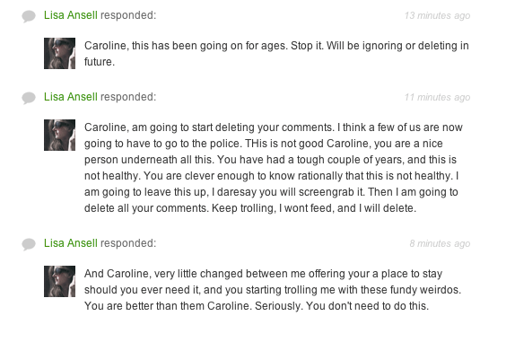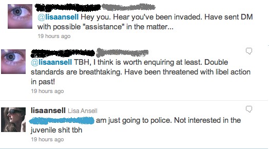 Understandably I’m a bit narked and tweet my frustration. Lisa is going to report me to the police for stalking, threatening and harassing her because someone, who wasn’t me has made a comment on her blog post.