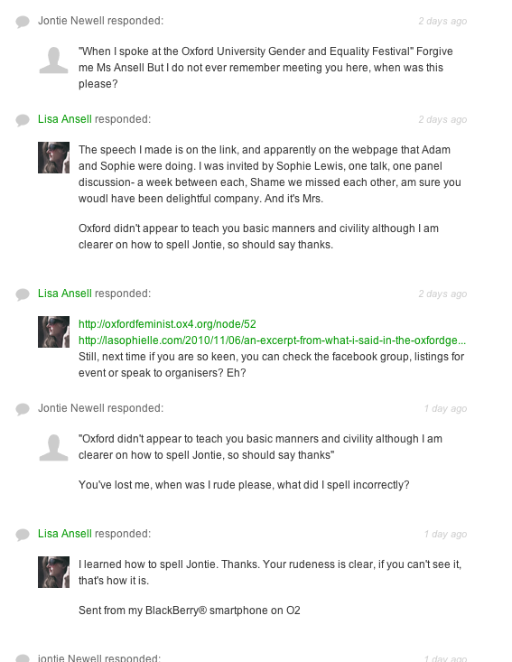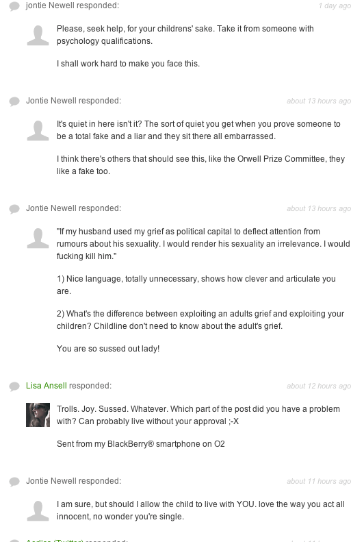 I added an extra screenshot in the interests of transparency. Jontie Newell does turn rather nasty and obviously the mention of the Orwell Prize has lead Lisa to conclude that the poster is me. Again, I reiterate – it really isn’t. I’d be really pleased if s/he could turn up and identify themselves.