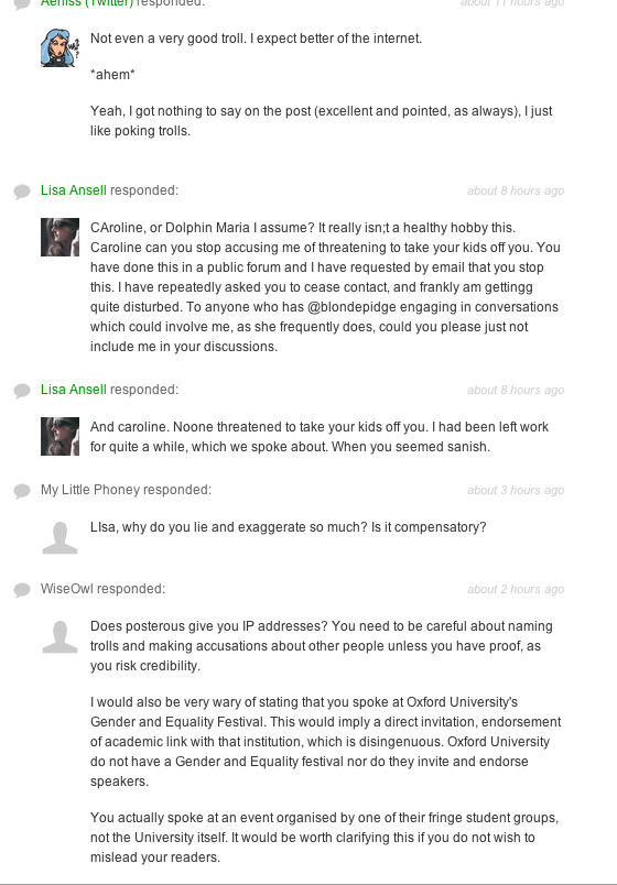 I think wise owl has it spot on really, if she’s going to declare that I am Jontie Newell, she needs to produce IP addresses (there can be no mistaking mine, my location and broadband provider are clearly named) to substantiate this. I would also agree that it’s not a good idea to mislead people into thinking that the University of Oxford had sought her expert opinion or views. But none of this is either trolling, or indeed my doing. Oh yes it is says Lisa. It’s so serious that there’s a group of them who are going to go to the police.