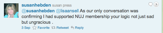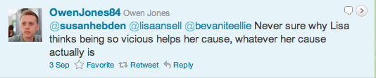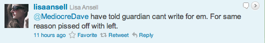 I noted first of all that it was with huge regret that Lisa had informed the Guardian that she could “no longer write for them”. I had no idea that she was employed by them, she’s submitted the odd Comment is Free piece, but then they invite everyone to do that. Still I hope they are not missing her too much.
