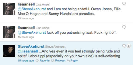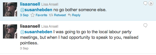 Then at the new year I had all that trouble with a fellow Twitter user, who incidentally expressed a lot of respect for Lisa, saying “hey look my friend has really politicised me” and who, by the looks of things, was trying to follow in her footsteps. Said user (I won’t give her real name) took umbrage at a comment I’d made on Twitter regarding the abolition of EMA (I’d said something like my children would never miss out on FE as a result of not receiving it, they won’t, we would go without to make sure that they had everything they need) she misconstrued it and tweeted about the fact that they had private trust funds. I blocked her, thinking that I could do without that kind of comment and she went off one posting about my wealthy lifestyle and that of my children. But we’ve had that saga already. I repeat, I no idea of this woman’s email address or home address so how I am supposed to have stalked and threatened her is beyond me.