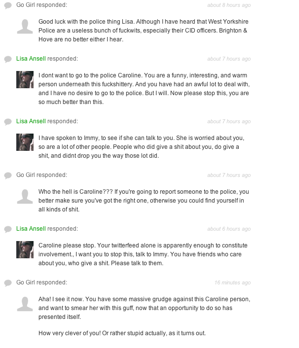 This was April 2010, a few weeks before the General Election and in the evening of my birthday, children finally in bed, I logged on for a bit of on-line company. There was a discussion about the Election and I mentioned that I was being influenced by the declaration of conscience launched by George Carey. All of a sudden Lisa Ansell launched in from nowhere and went absolutely ballistic, shouting, hectoring, calling me names and so on and so forth. Look, I said, it’s my birthday, I’m a bit miserable, lay off. “Boo fucking hoo” was her response and the thread ran into pages and pages and pages of her invective and abuse. Basically she laid into me for absolutely everything. I was just this very evil, nasty woman who had to be stopped. She hated the fact that I’d done some listening for women who had been victims of abortion, she decided that I must be manipulating and hurting women, she trotted out lurid stories of women being shut in a room and forced to handle models of tiny foetuses to make them feel guilty and so on and so forth. Who do you work for she demanded. Who? Who? Who? Someone must tell me, I WILL find out. She googled Care Confidential in Brighton and decided it was them. It isn’t. Does your employer know about your pro-life views she demanded. If they are as impartial as you say then you are LYING to them, and I will ring them up and tell them and if you aren’t I WILL EXPOSE THEM as employing a person like YOU. Of course she utterly missed the point, I was never employed I was a volunteer. She also threatened to phone up my husband’s bishop, who I should imagine would have just laughed at her , if i didn’t stop the pro-life work and tell everyone what an abusive sh*t she thought my husband was.