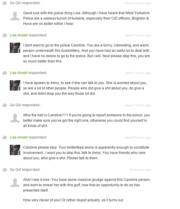 So the implication is clear. I have obviously been doing something to her. She has never engaged with me by “choice”. She was forced to send me streams of vitriolic email. She was forced to send her friends to warn me never to mention her name. She’s been forced to out me as a troll on her blog, and probably now she will be forced to go to the police. Or come out with all kinds of vicious allegations.