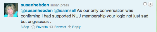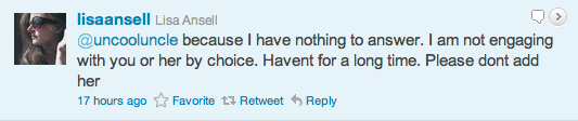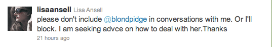 Other people have contacted me to offer unqualified support. Fortunately, several tweeters have emailed me to say that they have had to block her after receiving similar tirades. One person sought me out a few weeks ago, working out who I was from her tweets which named me and has sent me an email explaining how Lisa attempted to emotionally blackmail him into giving her business venture free publicity on his website and then threatened to publish all their correspondence on her blog if he did not comply.